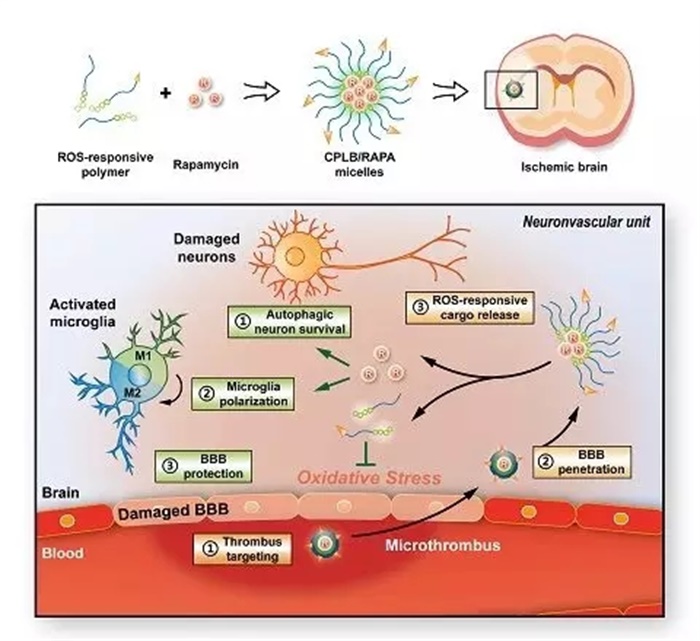 神经血管单元重塑聚合物胶束的构建和调控策略示意图