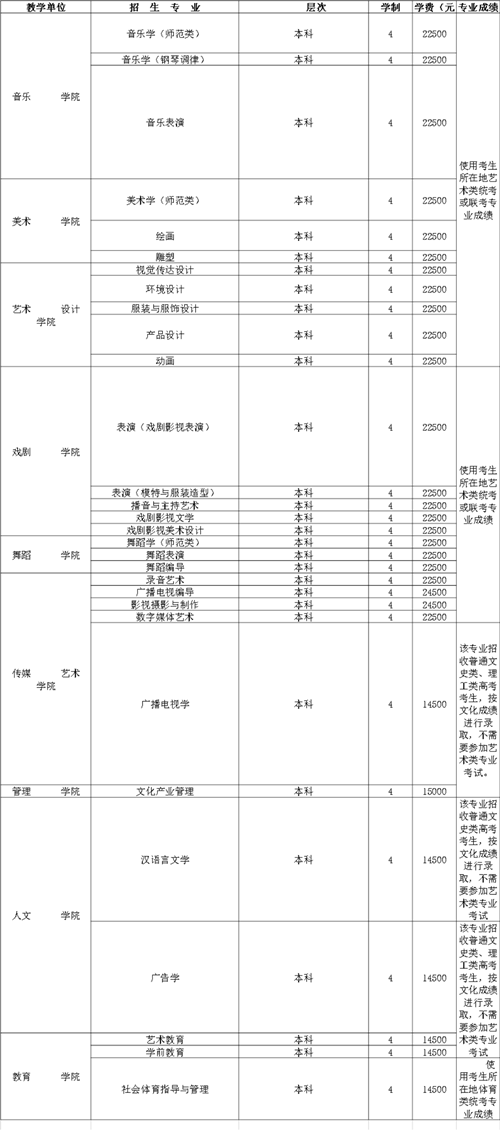 2.录取原则:艺术类专业、体育类专业在高考文化成绩和专业成绩达到考生所在省(市、自治区)最低录取控制分数线的前提下,按照考生报考志愿的先后顺序及考生的专业成绩从高分到低分进行录取,在第一志愿生源不足的情况下,接收其它志愿的考生;非艺术类文化产业管理、汉语言文学、广播电视学、广告学、艺术教育、学前教育专业在高考文化成绩达到所在省(市、自治区)最低录取控制分数线的前提下,按照考生报考志愿的先后顺序及考生的高考文化成绩从高分到低分进行录取,在第一志愿生源不足的情况下,接收其它志愿的考生。