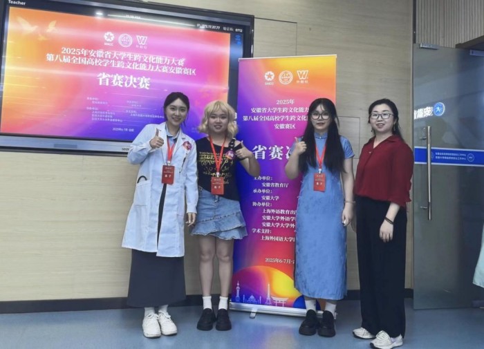 2025年5月至8月,安徽外国语学院2022级汉语国际教育专业韩文静、2023级汉语言文学专业周贇儿、2022级英语专业吴丽艳组成“Sparking”队,在2025年安徽省跨文化能力大赛英语B组校赛中一举夺魁,斩获特等奖。随后,该团队代表学校征战省赛,历经多轮角逐突出重围,最终在省级决赛中荣获三等奖,为校争光。