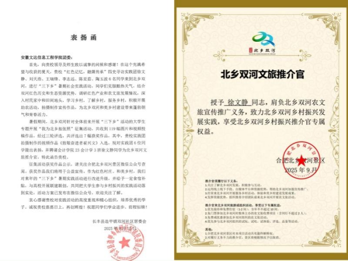 9月12日,长丰县造甲镇双河社区居委会向安徽文达信息工程学院发来表扬函,高度评价学校融媒体中心“红色记忆 融媒传承”四史寻访实践团在暑期“三下乡”社会实践活动中的优异表现。实践团成员徐文静同时被合肥北乡双河景区正式聘任为“北乡双河文旅推介官”。
