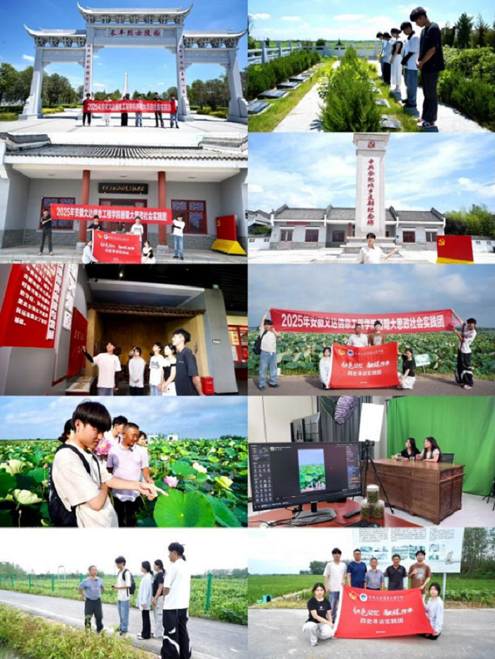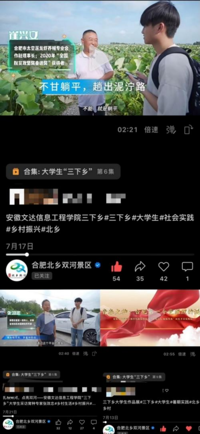今年暑期,由徐文静、刘天浩、王瑞锋、李志远、陈亚茹、陶玉波六名同学组成的实践团,奔赴合肥北乡双河开展社会实践。同学们不畏酷暑,深入乡村一线,走访农户田头,充分发挥专业特长,围绕当地红色资源与乡村振兴实践,创作出多部高质量宣传作品,为当地美丽乡村建设贡献了青春智慧与力量,获得当地干部群众的一致好评。