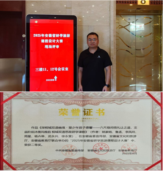 近日,由中共安徽省委宣传部、安徽省文化和旅游厅、安徽省教育厅联合主办的2025年安徽省研学旅游课程设计大赛落下帷幕。由通识教育学院就业创业教研室姚家皓等七位教师共同设计的《探桐城双遗幽静·塑少年君子德馨——六尺巷间悟礼让之道,文庙阶前沐儒风雅韵 桐城双遗思政研学课程》荣获二等奖。