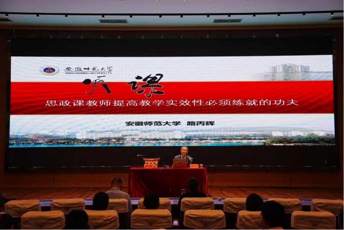 为深入学习贯彻党的教育方针,加强学校思想政治教育,全面提升师生思想政治素养。9月24日下午,安徽外国语学院在学术报告厅开展“思政名师讲堂”活动,特邀党的二十大代表、全国最美思政课教师、安徽师范大学马克思主义学院路丙辉教授,为老师们带来题为《养课:思政课教师提高教学实效性必须练就的功夫》的专题讲座。安徽外国语学院校领导、全体思政课老师、辅导员以及部分学院师生参加。讲座由安徽外国语学院校长周之虎主持,党委书记王红月作总结讲话。