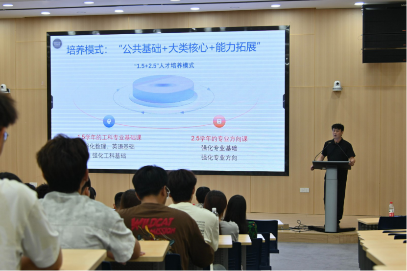 仪式伊始,招生办公室主任、教务处副处长胡一鸣详细介绍了工科试验班的选拔情况。胡一鸣介绍,本次试验班报名工作共吸引了744名学生参与,经过严格筛选最终录取36人。试验班将采用“厚基础、宽口径、强创新、重实践”的培养模式,构建“公共基础课程 + 大类核心课程 + 能力拓展课程”的立体化课程体系,并实行班主任与专业导师双轨负责制。通过推动多学科交叉融合、组建导师团队开展协同指导、将科研竞赛深度融入教学过程等举措,全力打造独具特色的拔尖工科人才培养体系。胡一鸣还表示,在开班筹备阶段,学校已广泛收集新生关于学习方式偏好、未来发展目标等方面的意见建议。学校将积极吸纳学生合理建议,未来将进一步严格班级管理标准、优化课程资源配置、完善动态退出机制,同时鼓励学生增强自主学习意识,确保培养方案兼具科学性与适应性,更好满足学生成长发展需求。