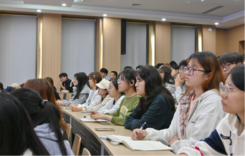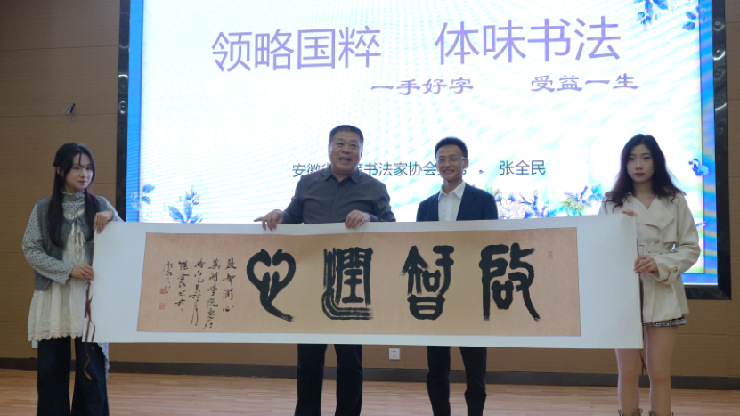 张全民以《领略国粹 体味书法——与青年大学生谈书法》为主题作专题报告。他向芜湖学院赠送了一幅亲笔创作的篆书作品《启智润心》,笔墨间尽显篆书古朴典雅的艺术风格。讲座中,张全民系统梳理了中国书法三千余年的历史演变脉络,从甲骨文的瘦劲挺拔到楷书的端庄工整,清晰展现了汉字书法的艺术传承。他围绕“如何欣赏中国书法”“学习书法的好处”“怎样练出一手好字”三个核心维度,为现场学子带来了一场兼具知识性与实用性的书法盛宴。对于如何习练书法,他强调要以兴趣为先导,通过观赏古碑帖培养热情;掌握“三指执笔法”与标准坐姿;遵循“取法乎上”原则,选取自己喜欢的字帖;践行“读、摹、临、背、意、用”六字法,集中力量先练好前100个常用字。