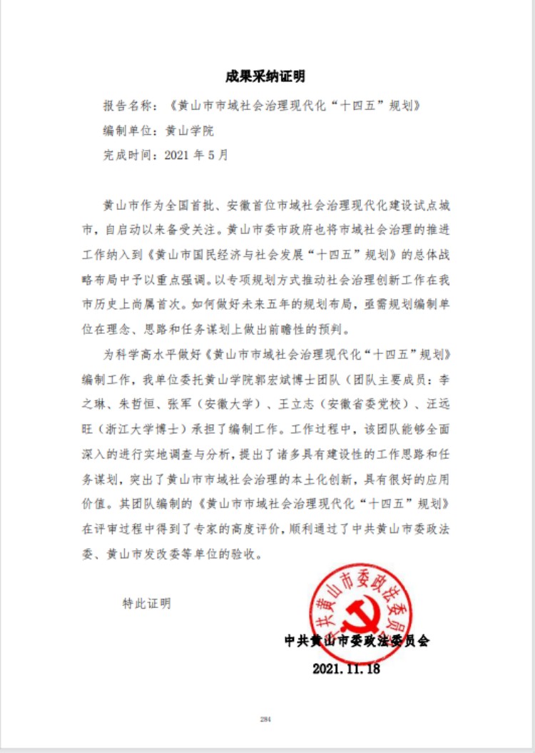黄山市市域社会治理现代化研究中心则聚焦社会治理创新与平安建设,为地方治理提供专业支撑。中心牵头编制的《黄山市市域社会治理现代化“十四五”规划》,是黄山市作为全国首批、安徽首位市域社会治理现代化试点城市的重要指导文件;制定的《社区矫正社会工作服务规范》(DB3410/T31-2023),填补了黄山市社区矫正服务标准空白,帮助黄山市社区矫正工作始终领跑全省。郭宏斌团队在此领域成果丰硕,不仅在《社区心理学研究》《中国社会工作》等核心期刊发表多篇论文,主持安徽省高校人文社科重点项目及安徽省法学会调研课题,研发的《“更生护航”社区矫正对象自陈量表》心理评估模型被引入全省社区矫正智能管理平台,成为全省通用模版。“屯安红袖”志愿服务项目还荣获屯溪区第三届新时代文明实践志愿服务项目优秀奖,该项目通过建立公益活动项目库、组建志愿服务队伍,有效推动社区矫正劳动教育创新与基层社会治理融合。