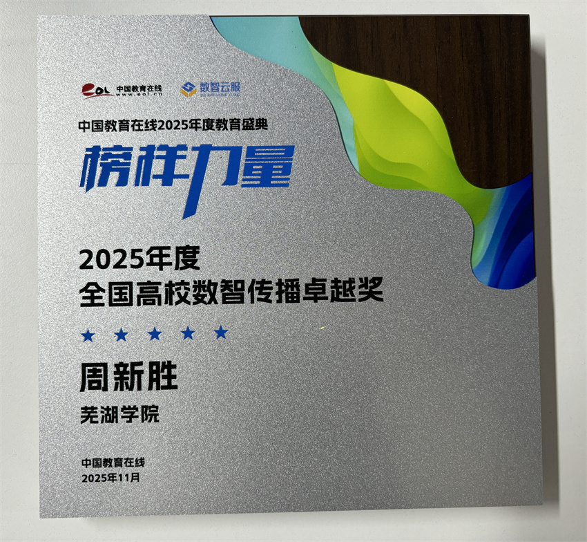 此次周新胜老师荣获“2025年度全国高校数智传播卓越奖”,不仅为学校争得了荣誉,也为全国高校传播工作者树立了榜样。在未来的工作中,周新胜老师将继续砥砺前行,深入探索数智传播的无限可能,为学校的文化传承与创新发展,以及全国高校数智传播事业的进步贡献更多的智慧与力量。在周新胜老师的引领下,芜湖学院将在数智传播领域持续创新突破,为推动高校现代化传播体系建设注入强劲动力。