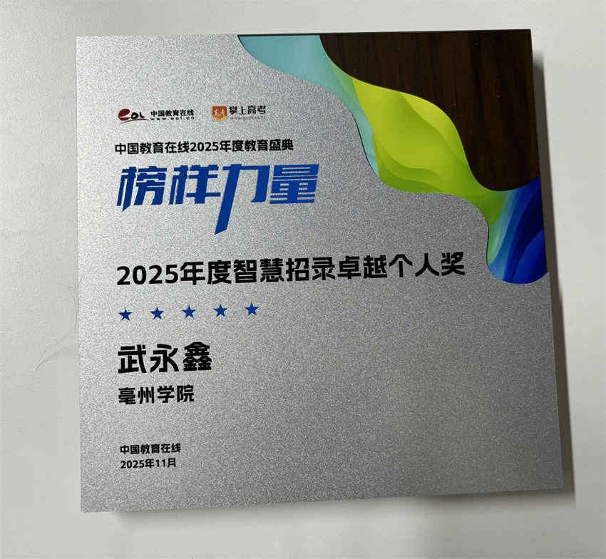 近日,中国教育在线“榜样力量·2025年度教育盛典”优秀案例名单公布。亳州学院武永鑫老师凭借在招录工作中对智慧招录相关技术工具的高水平运用及卓越成果,获评“2025年度智慧招录卓越个人”称号。