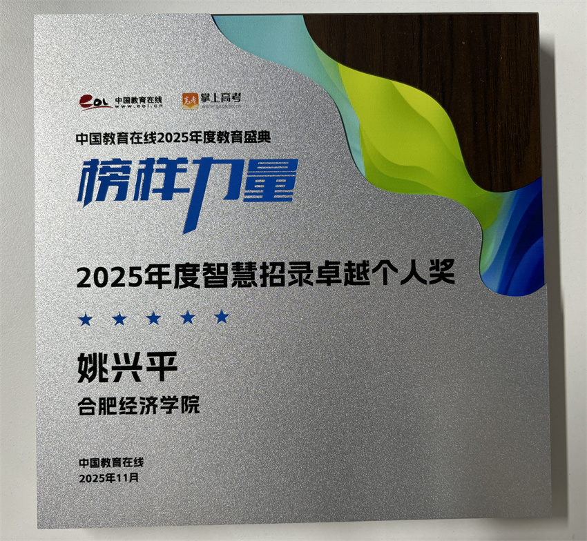 近日,中国教育在线“榜样力量·2025年度教育盛典”优秀案例名单公布。合肥经济学院姚兴平老师凭借在招录工作中对智慧招录相关技术工具的高水平运用及卓越成果,获评“2025年度智慧招录卓越个人”称号。