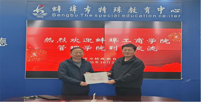 与此同时,阮进兵书记、赵骏书记与蚌埠特殊教育中心领导围绕今后合作交流事宜展开深入探讨。双方一致表示,将进一步加强沟通协作,整合资源优势,共同为特殊儿童的健康成长、全面发展搭建更好的平台,贡献更多力量。活动最后,蚌埠特殊教育中心向管理学院授予爱心证书,以表彰学院此次爱心之举,感谢学院为特殊儿童带来的温暖与关怀。