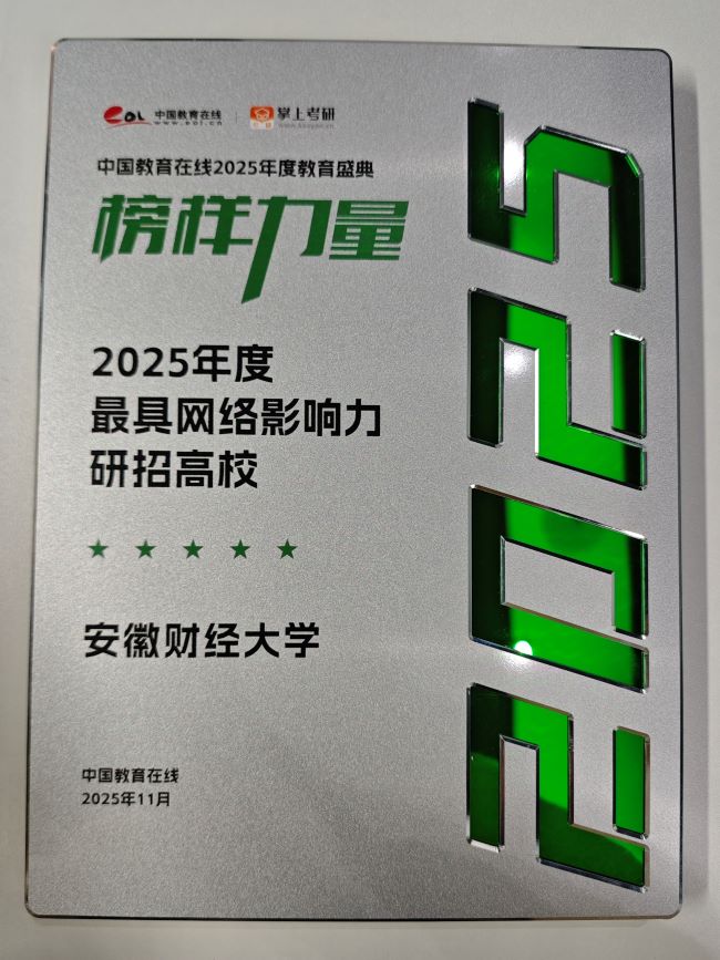近日,中国教育在线“榜样力量·2025年度教育盛典”优秀案例名单公布。安徽财经大学凭借极具创新性与前瞻性的招生宣传策略,以及扎实的宣传执行实力,从众多高校中突围,获评“2025年度最具网络影响力研招高校”。