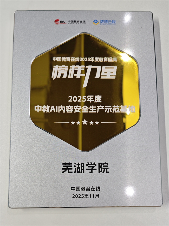 近日,中国教育在线“榜样力量·2025年度教育盛典”优秀案例名单公布。芜湖学院凭借在新媒体领域的卓越成就与深远影响力,荣获 “2025年度中教AI内容安全生产示范基地”。