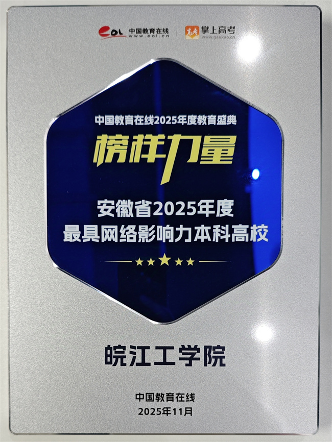 近日,中国教育在线“榜样力量·2025年度教育盛典”优秀案例名单公布。皖江工学院凭借极具创新性与前瞻性的招生宣传策略,以及扎实过硬的宣传执行实力,从众多高校中突围,获评“安徽省2025年度最具网络影响力本科高校”。