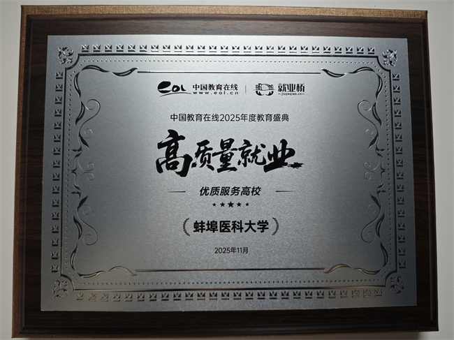 为深入贯彻党中央、国务院关于促进高校毕业生等青年就业创业的决策部署,落实《人力资源社会保障部 教育部 财政部关于做好2025年高校毕业生等青年就业工作的通知》等最新政策精神,挖掘和推广就业工作典型。中国教育在线·就业桥举办了“高质量就业”2025年度教育盛典活动,表彰高校就业工作数智化转型,创新实践的优秀案例,对推动高校就业跨越式发展,汇聚创新动力的榜样单位进行推广。蚌埠医科大学应邀参选并荣获“2025高质量就业·优质服务高校”荣誉称号。