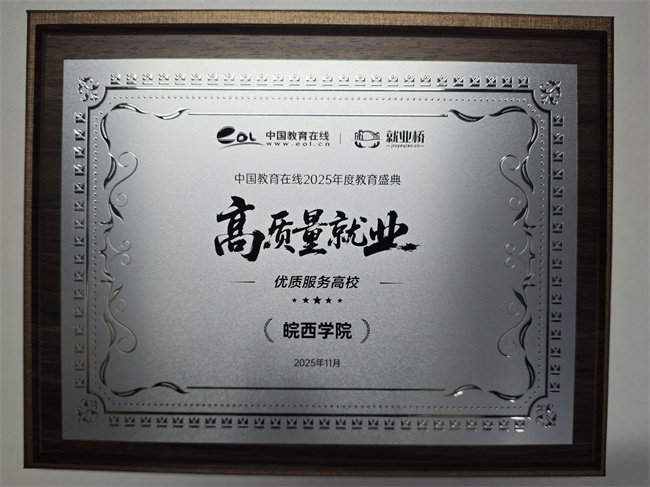 为深入贯彻党中央、国务院关于促进高校毕业生等青年就业创业的决策部署,落实《人力资源社会保障部 教育部 财政部关于做好2025年高校毕业生等青年就业工作的通知》等最新政策精神,挖掘和推广就业工作典型。中国教育在线·就业桥举办了“高质量就业”2025年度教育盛典活动,表彰高校就业工作数智化转型,创新实践的优秀案例,对推动高校就业跨越式发展,汇聚创新动力的榜样单位进行推广。皖西学院应邀参选并荣获“2025高质量就业·优质服务高校”荣誉称号。