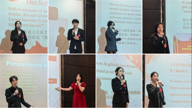 来自德语、俄语、法语、西班牙语、葡萄牙语五个专业的参赛选手,深刻领会把握《习近平谈治国理政》的精髓要义和实践要求,围绕“担当时代责任,争做有为青年”“自我革命引领社会革命”“努力实现高水平科技自立自强”“中外文明互鉴”等主题,用流利的外语讲述中国故事、讲述身边的故事、讲述自己的故事。他们以精准的语言表达、鲜明的观点立场和真挚的情感流露,赢得了现场观众的阵阵掌声,生动展现了外语专业大学生的国际视野、担当精神和创新意识。经过激烈的角逐,评委组从主题契合度、语言流畅度、逻辑清晰度、现场感染力等多个方面进行综合评分,来自西班牙语专业的学生黄宝钰获得一等奖。