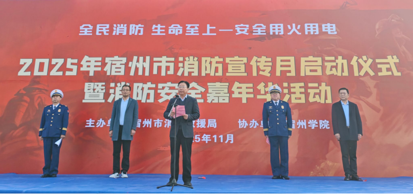 11月5日,宿州学院联合宿州市消防救援局举行2025年消防宣传月启动仪式暨消防安全嘉年华活动。宿州学院党委常委、副校长杨维志,市消防救援局副支队长刘海飞,市应急管理局副局长雷鸣、市安委会成员单位相关负责同志及宿州学院相关职能部门、二级学院负责人、学生代表等参加活动。