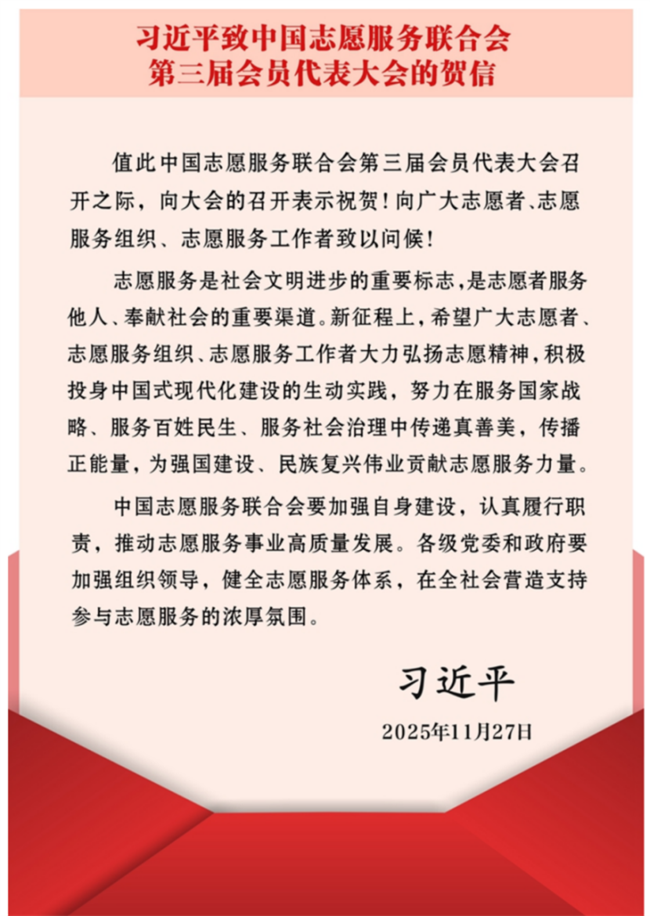 11月27日至28日,中国志愿服务联合会第三届会员代表大会在京召开,中共中央总书记、国家主席、中央军委主席习近平发来贺信,向大会的召开表示祝贺,向广大志愿者、志愿服务组织、志愿服务工作者致以问候。
