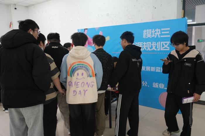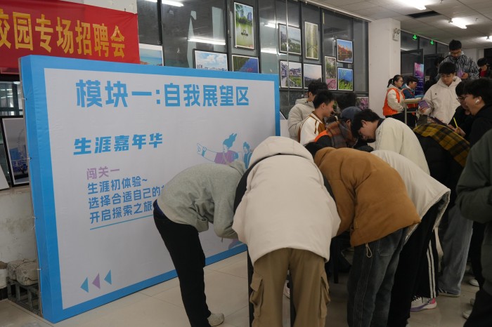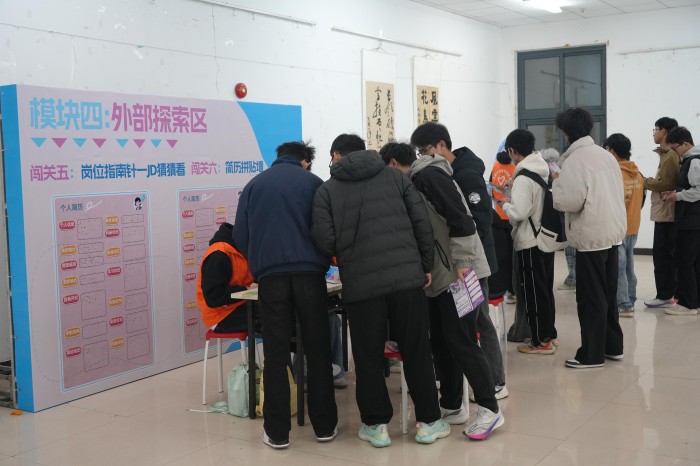 活动现场精心设置了自我展望区、自我探索区、生涯规划区、外部探索区、就业意识区、AI就业赋能区和礼品大放送区等七个模块,以创新闯关游戏为载体,摒弃枯燥的理论灌输,将自我认知、职业探索、目标拆解等职业生涯规划核心要素巧妙融入游戏中,通过沉浸式体验,引导学生主动思考未来发展方向,明确个人定位与行动路径,进而科学搭建职业生涯发展框架。