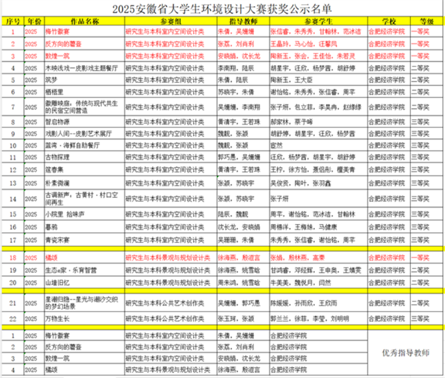 近日,由安徽省教育厅主办,安徽工程大学承办的“2025年安徽省大学生环境设计大赛”获奖名单公布,合肥经济学院艺术设计学院学子再展风采,在本次比赛中取得一等奖4项、二等奖7项、三等奖11 项的好成绩。
