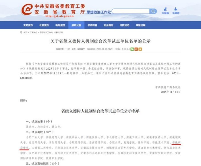 近日,中共安徽省委教育工作领导小组秘书处、中共安徽省委教育工委联合发布省级立德树人机制综合改革试点单位名单,安徽新华学院成功入选省级立德树人机制综合改革试点高校。此次获批既是省教育主管部门对学校长期以来坚持立德树人根本任务、创新育人模式成果的高度认可,更是学校深入贯彻落实教育强国建设要求、推进人才培养质量提升的重要契机。