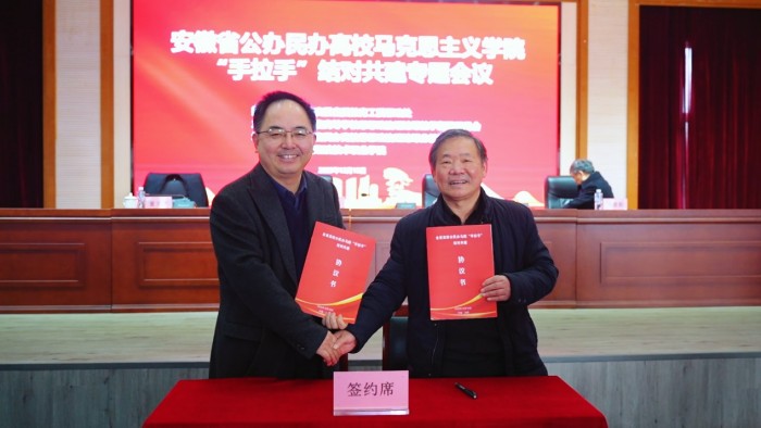 12月18日上午,安徽省公办和民办高校马克思主义学院“手拉手”结对共建专题会议在合肥召开。芜湖学院省思政课教指委委员赵平教授、马克思主义学院院长王义德教授参会。会上,王义德与姚宏志分别代表芜湖学院马克思主义学院、安徽师范大学全国重点马克思主义学院,正式签订了结对共建协议。