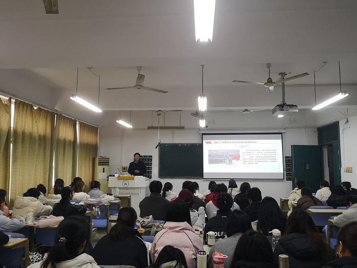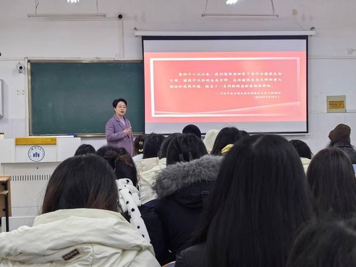 厚植生态理念,涵育家国情怀。12月24日,校党委副书记胡林娜向设计类专业学生讲授生态文明建设专题思政课。课程逻辑清晰、层层深入,融合理论讲解、视频案例与互动讨论于一体,并以“焦岗湖的蜕变”等鲜活事例,生动展现新时代生态文明建设成就,引导学生树立生态文明理念,把个人理想融入国家发展大局。