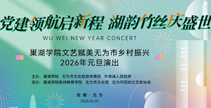 2026年1月1日,“党建领航启新程 湖韵竹丝庆盛世”巢湖学院文艺赋美无为乡村振兴元旦演出在无为市牛埠镇竹丝湖举办。本次活动由巢湖学院、无为市文旅体局和牛埠镇人民政府共同主办,巢湖学院教师教育学院、无为市文化馆、无为市民间文艺家协会承办。巢湖学院党委委员、组织部部长柯应根,教师教育学院党委书记胡传双、院长蔡广、副院长马磊,无为市牛埠镇党委书记伍先群,市文化旅游体育局副局长陈雪,文化馆副馆长曹晨、易媛媛等出席活动。