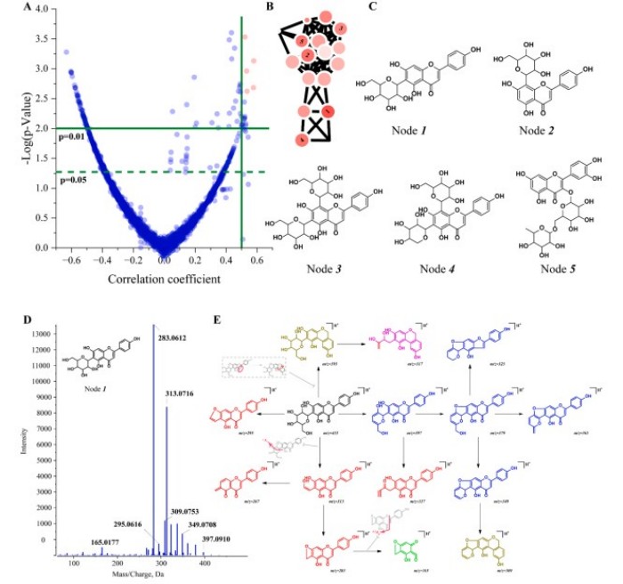 针对溃疡性结肠炎这一慢性炎症性肠病,团队创新采用活性标记分子网络技术(ALMN),从铁皮石斛3700种代谢分子中筛选出5种核心抗炎活性分子,其中异牡荆素(Isovitexin)表现突出。动物实验证实,异牡荆素可通过抑制PI3K/AKT信号通路,修复肠道上皮屏障功能、调节细胞自噬,同时显著改善肠道菌群多样性,富集产丁酸菌等有益菌、减少致病菌丰度,调节短链脂肪酸代谢水平,有效缓解葡聚糖硫酸钠(DSS)诱导的小鼠结肠炎症状,为治疗溃疡性结肠炎的天然药物开发提供了全新候选分子。