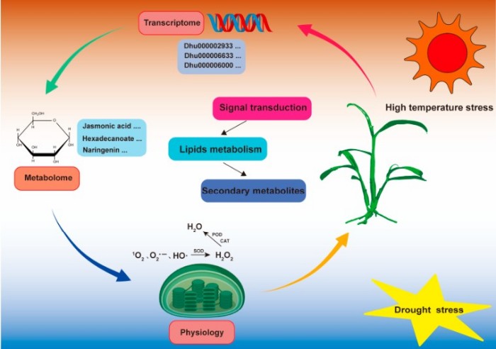 针对石斛栽培中面临的干旱、高温、盐胁迫等环境挑战,团队通过生理、转录组和代谢组整合分析,系统阐明了石斛的抗逆调控网络。研究发现,在干旱与高温复合胁迫下,霍山石斛通过激活信号转导、脂质代谢和次生代谢物biosynthesis三大核心通路,协同提升抗氧化酶活性与黄酮类、类胡萝卜素等抗逆物质积累,其中高温胁迫是影响其生理代谢的主导因素。