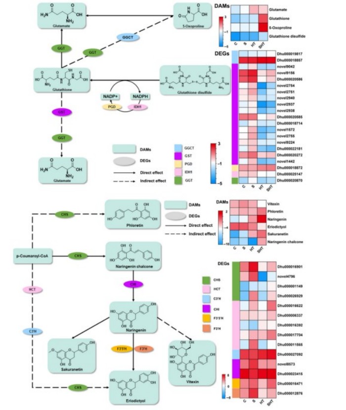 在盐与高温复合胁迫研究中,团队进一步揭示霍山石斛通过强化谷胱甘肽代谢和黄酮类化合物合成,激活SOD、POD、CAT等酶促抗氧化系统,清除过量活性氧,维持细胞redox稳态的防御机制,明确了CHS、CHI等关键基因和谷胱甘肽、柚皮素查尔酮等核心代谢物的调控作用,为抗逆优质石斛品种的选育提供了理论依据。