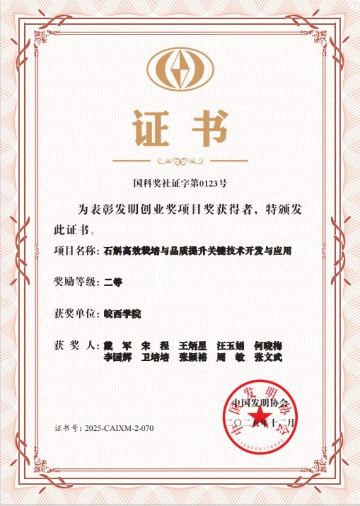 在基础研究的同时,团队坚持产学研融合,针对石斛栽培中的品质不稳定、资源利用率低等产业痛点,研发出一套涵盖优质种苗繁育、环境调控、精准采收的高效栽培与品质提升关键技术。该技术通过优化生长环境、调控栽培周期,显著提高了石斛活性成分含量,降低了资源浪费,实现了药用品质与生产效益的同步提升。相关技术成果已在海南海口、安徽霍山等地的石斛种植基地推广应用,有效推动了当地石斛产业的标准化、规模化发展,凭借其显著的经济价值和社会效益,该项目荣获2025年度中国发明协会发明创业奖二等奖,得到行业权威认可。