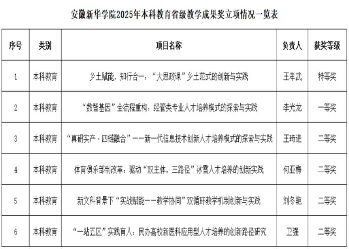 近日,安徽省教育厅公布了2025年省级教学成果奖获奖名单。安徽新华学院在此次评选中共荣获特等奖1项、一等奖1项、二等奖4项,获奖总数与最高等级均位居全省民办高校首位,实现了安徽新华学院在该奖项上的历史性突破。