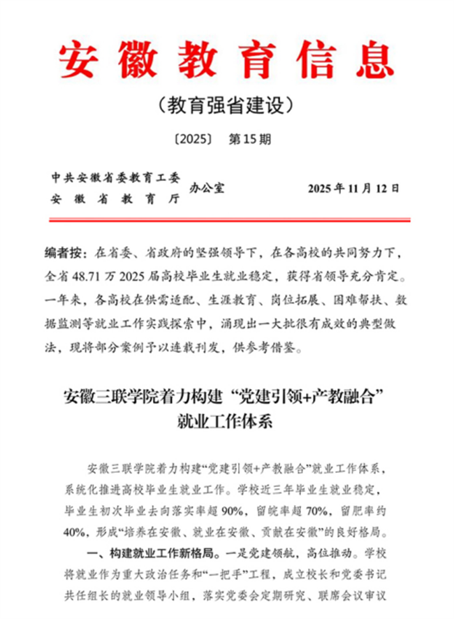 2025届毕业生初次去向落实率位居全省本科高校前列。学校获“安徽省高校毕业生就业工作成效突出单位”通报表扬,“党建引领+产教融合”就业工作案例被《安徽教育信息(教育强省建设)》刊发推介,形成良好示范效应。
