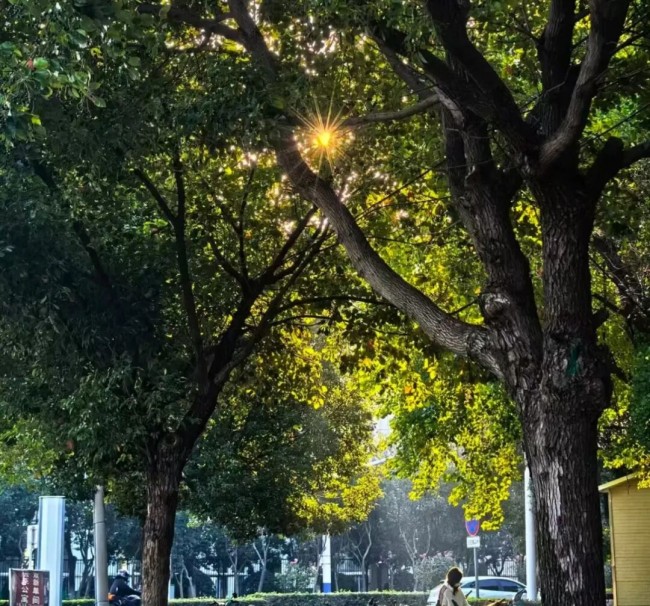 晨光穿透枝叶,