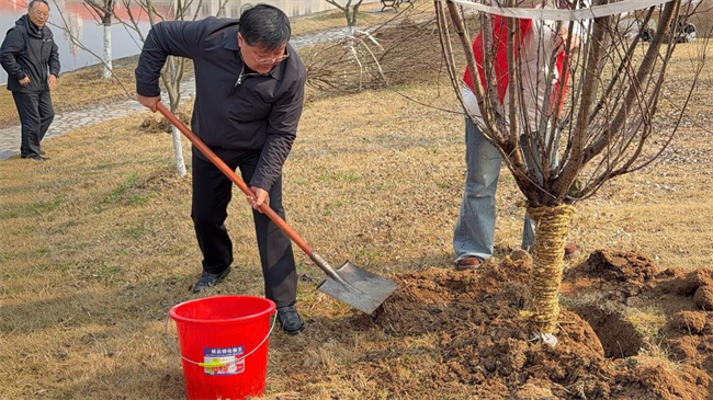 师生们热情高涨,现场呈现一片繁忙有序的劳动景象。大家分工协作,从挖坑、扶苗培土到提水浇灌,每一道工序都认真细致、一丝不苟。劳动间隙,欢声笑语和铁锹声此起彼伏,汗水与热情共同孕育着绿色的希望。在和煦的春风中,一株株新绿迎风挺立,为春日的校园注入了盎然生机,也生动展现了安外人团结协作、积极向上的精神风貌。