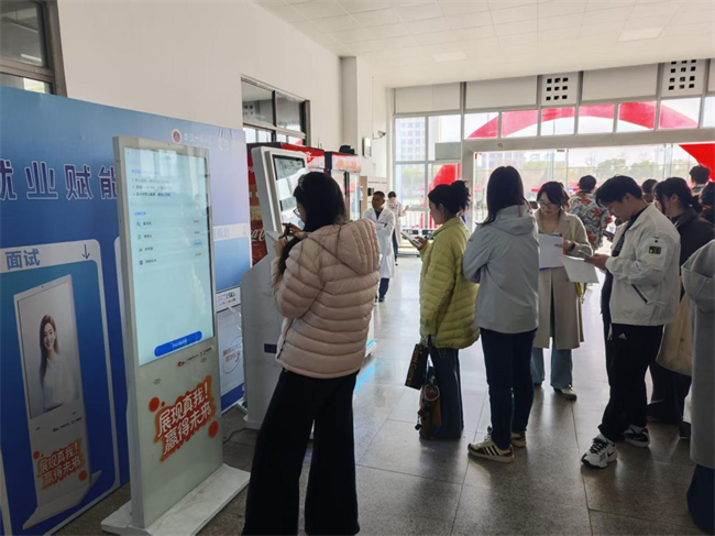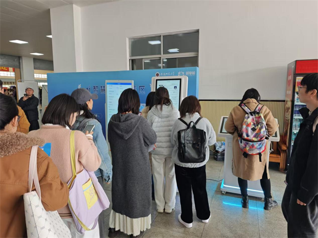 招聘会现场除求职双选主体区域外,还同步设置校企合作、校友服务、征兵宣传、就业指导、AI就业赋能区等功能专区,其中AI就业赋能区配备面试、简历、生涯探索三台智能终端,为毕业生提供一站式智能求职服务:简历一体机可帮助学生快速完成简历的智能诊断、优化生成,还可同步预测目标岗位面试常见问题;面试一体机支持岗位定制化模拟面试,可还原真实面试场景,面试后生成分析报告助力学生复盘提升;生涯探索一体机则可提供个性化生涯测评与规划指导,帮助学生明确职业发展方向。