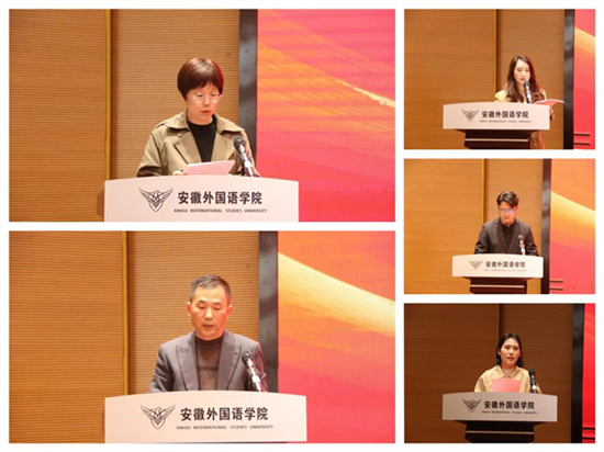 教学院部代表牛芳芳、党政管理人员代表张恩志、专任教师代表徐桢、教辅人员代表陈士文以及辅导员代表代安娜依次上台发言。他们在发言中回顾了迎评攻坚历程,分享了岗位实践心得,彰显了安徽外国语学院教职员工同心聚力、担当奉献的精神风貌。