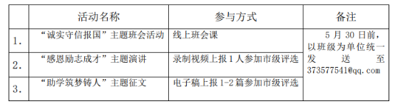 各班级积极开展主题班会、主题演讲、征文比赛等活动,加大资助政策宣传,让资助政策深入人心,推进学生资助工作顺利有序地开展,进一步加强学生的诚信、感恩和励志教育。