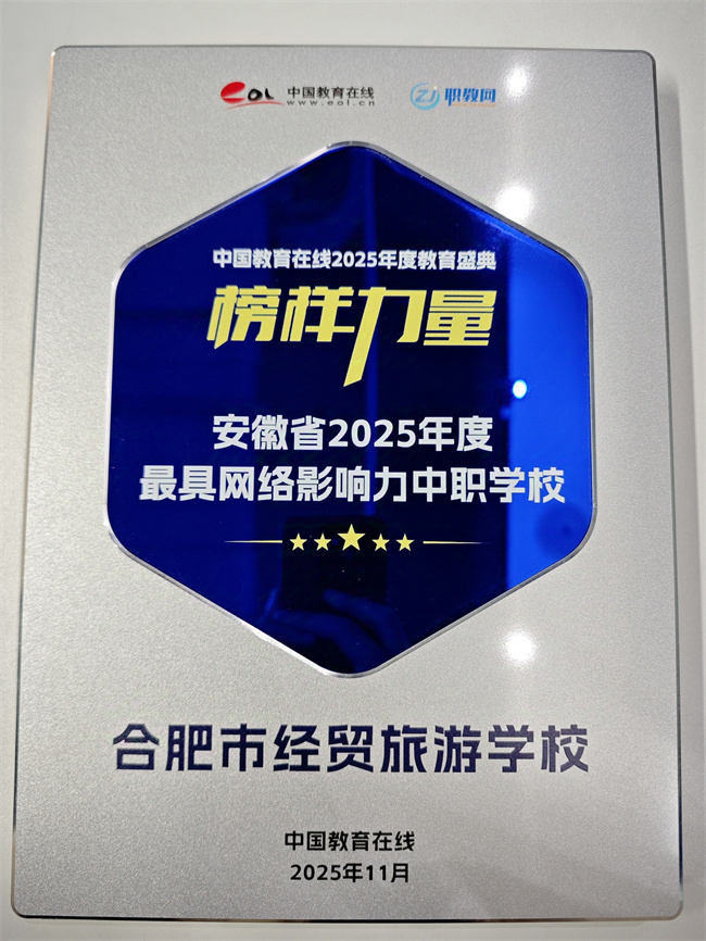 近日,中国教育在线“榜样力量·2025年度教育盛典”优秀案例名单公布。合肥市经贸旅游学校凭借在网络领域的卓越表现与深远影响力,荣获“安徽省2025年度最具网络影响力中职学校”的称号。