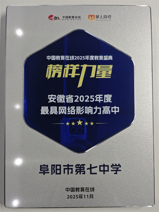 近日,中国教育在线“榜样力量·2025年度教育盛典”优秀案例名单公布。阜阳市第七中学凭借在网络领域的卓越表现与深远影响力,荣获 “安徽省2025年度最具网络影响力高中”的称号。