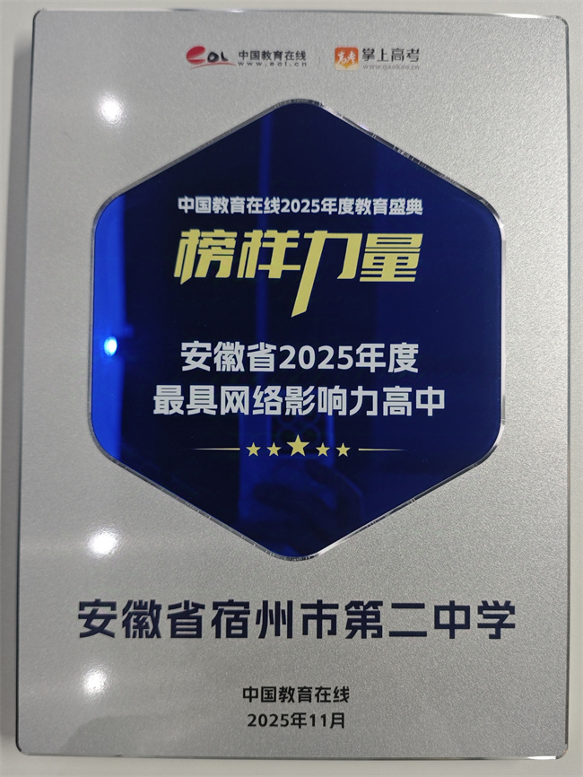 近日,中国教育在线“榜样力量·2025年度教育盛典”优秀案例名单公布。安徽省宿州市第二中学凭借在网络领域的卓越表现与深远影响力,荣获 “安徽省2025年度最具网络影响力高中”的称号。