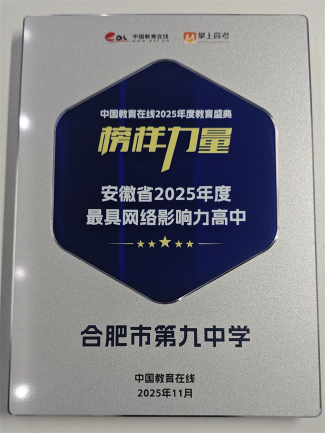 近日,中国教育在线“榜样力量·2025年度教育盛典”优秀案例名单公布。合肥市第九中学凭借在网络领域的卓越表现与深远影响力,荣获 “安徽省2025年度最具网络影响力高中”的称号。