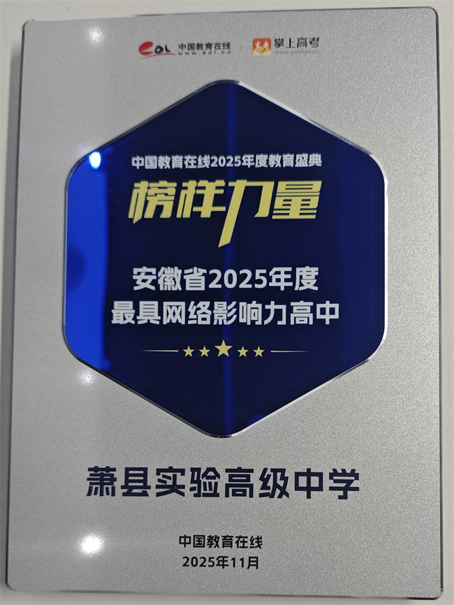 近日,中国教育在线“榜样力量·2025年度教育盛典”优秀案例名单公布。萧县实验高级中学凭借在网络领域的卓越表现与深远影响力,荣获 “安徽省2025年度最具网络影响力高中”的称号。