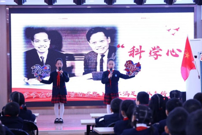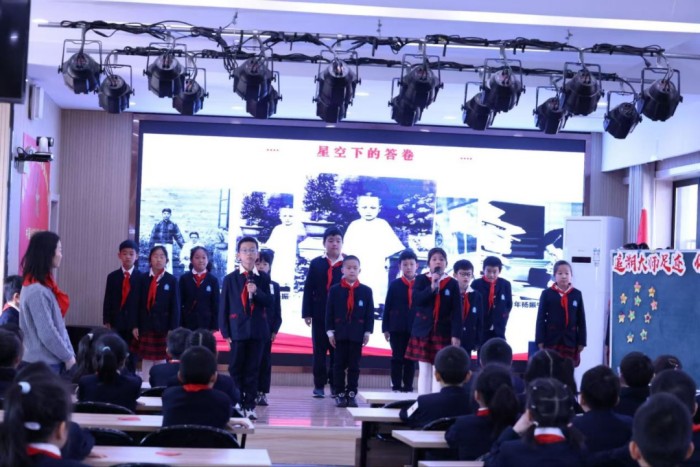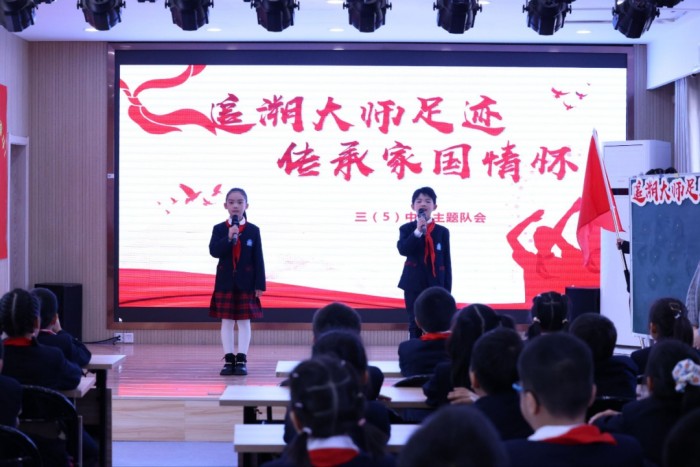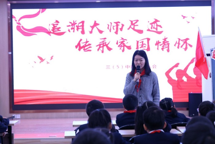 三(5)中队在中队辅导员都红蕾老师的指导下,以“追溯大师足迹,传承家国情怀”为主题,通过形式多样的节目编排,让少先队员感受祖国的心跳、时代的脉搏。
