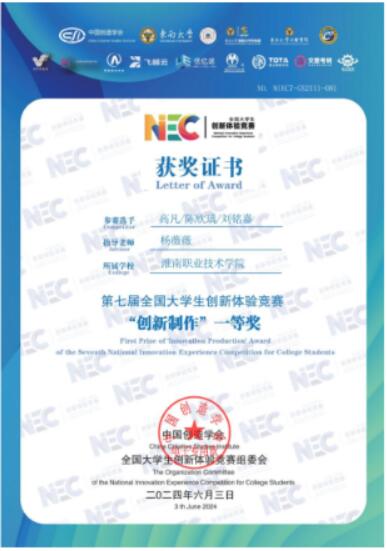 本届创新体验竞赛全国设有16个赛区,通过各个区域赛选拔出优秀团队进入全国复赛和决赛,淮南职业技术学院作品以安徽赛区一等奖的好成绩入围全国总决赛。在全国复赛和决赛中,经过为期七天答辩,得到专家和评委的一致好评最终取得了优异成绩。