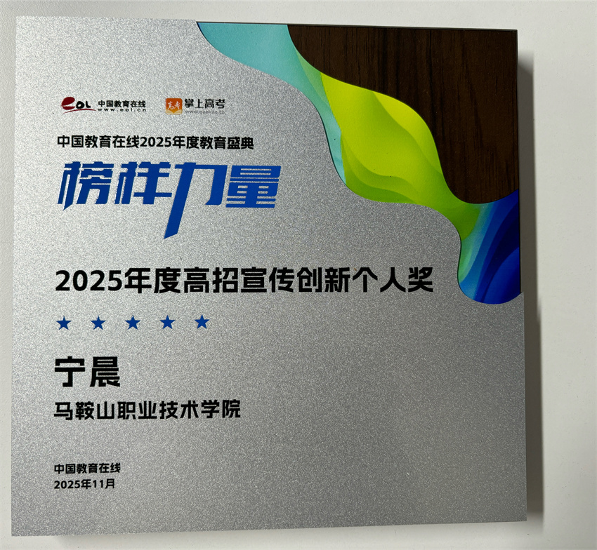 近日,中国教育在线“榜样力量·2025年度教育盛典”优秀案例名单公布。马鞍山职业技术学院宁晨老师凭借在招录工作中的创新能力和独到见解,获评“2025年度高招宣传创新个人”称号。