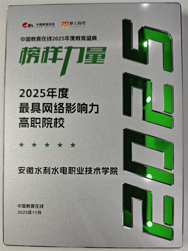 近日,中国教育在线“榜样力量·2025年度教育盛典”优秀案例名单公布。安徽水利水电职业技术学院凭借极具创新性与前瞻性的招生宣传策略,以及扎实过硬的宣传执行实力,从众多高校中突围,获评“2025年度最具网络影响力高职院校”。