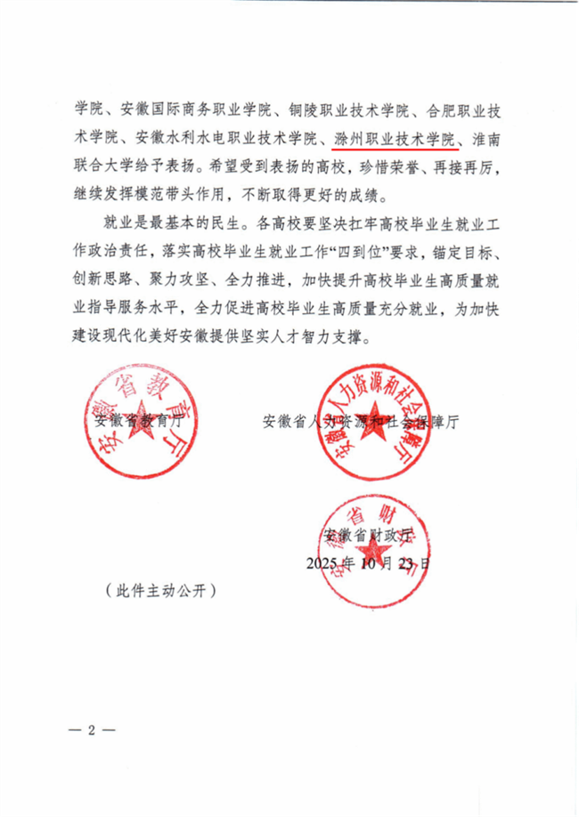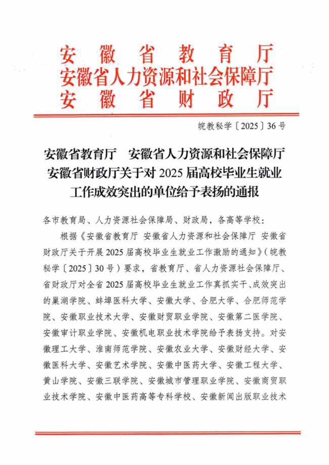 近日,安徽省教育厅、省人力资源和社会保障厅、省财政厅联合发文,对2025届高校毕业生就业工作成效突出的单位予以通报表扬,滁州职业技术学院名列其中。这是滁州职业技术学院毕业生就业工作继2022年、2024年获激励,2023年获表扬后,再次获得省级表彰,充分体现了滁州职业技术学院在毕业生就业工作中的持续努力与突出成效。