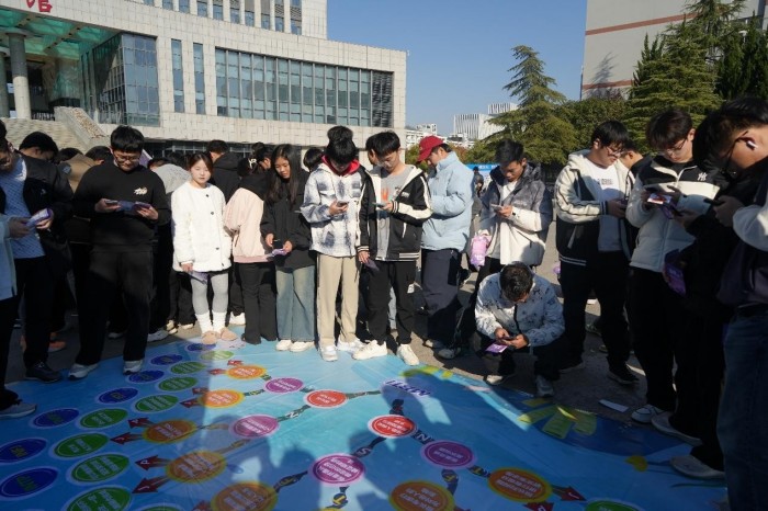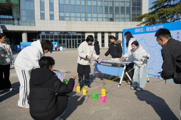 就业意识区里,“梦想之城”成为学子寄托期许的重要载体,大家在完成前期闯关后,为自己的职业梦想选定目标城市,写下心愿便签并悬挂于对应坐标,定格对未来的憧憬;“齐心协力——步步高升”环节通过团队协作任务,让学子在互动中学会发挥个人优势、凝聚团队力量,培养职场必备的协作能力。